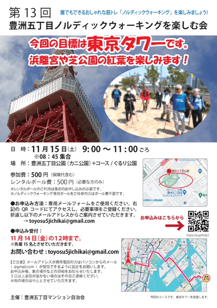 今回は東京タワーを目指します。紅葉の浜離宮や芝公園を楽しみます。 お申込みはこちらまで → https://docs.google.com/forms/d/e/1FAIpQLSe6SWbvnSKcjPFh4pHJt_Tue1btx3cX10CdkFl2CUaORdNiBQ/viewform 11月14日(金)12時まで受け付けます。先着15名様ま...